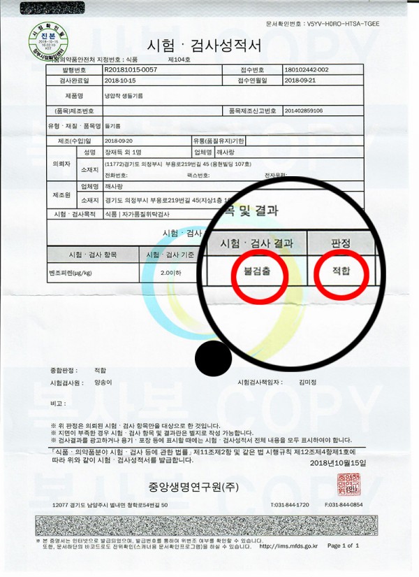 냉압착 생들기름 벤조피렌 검사 수치 불검출 입니다.